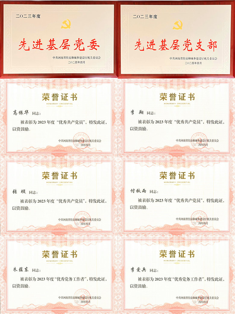 根據(jù)中共河南省住房和城鄉(xiāng)建設(shè)廳機(jī)關(guān)黨委印發(fā)《關(guān)于表彰2023年度優(yōu)秀共產(chǎn)黨員、優(yōu)秀黨務(wù)工作者和先進(jìn)基層黨組織的通報(bào)》(豫建機(jī)黨〔2024〕16號(hào)),河南省住房和城鄉(xiāng)建設(shè)廳直屬機(jī)關(guān)工會(huì)印發(fā)《關(guān)于表彰2023年度廳直工會(huì)工作先進(jìn)集體和先進(jìn)個(gè)人的通報(bào)》(豫建工直〔2024〕1號(hào)),我公司黨委及員工獲得表彰。