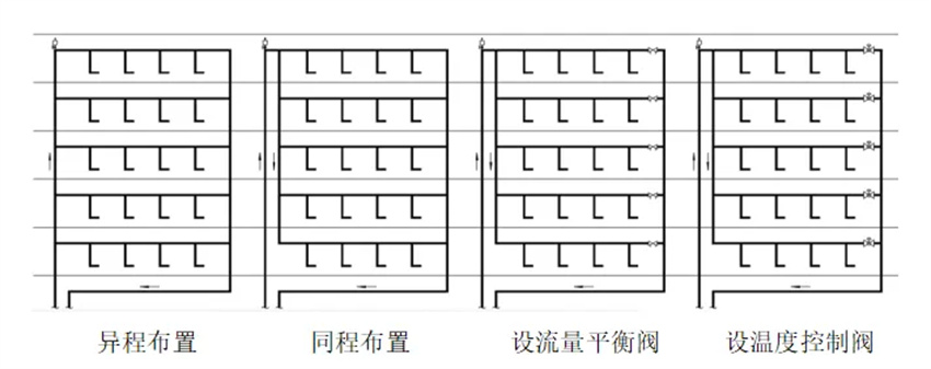 供回水管網(wǎng)同程布置:各層熱水干管管長(zhǎng)、不變徑情況下,通過調(diào)整回水管閥門開啟度,易保證各層橫管內(nèi)的水循環(huán),在熱水系統(tǒng)中經(jīng)常采用。