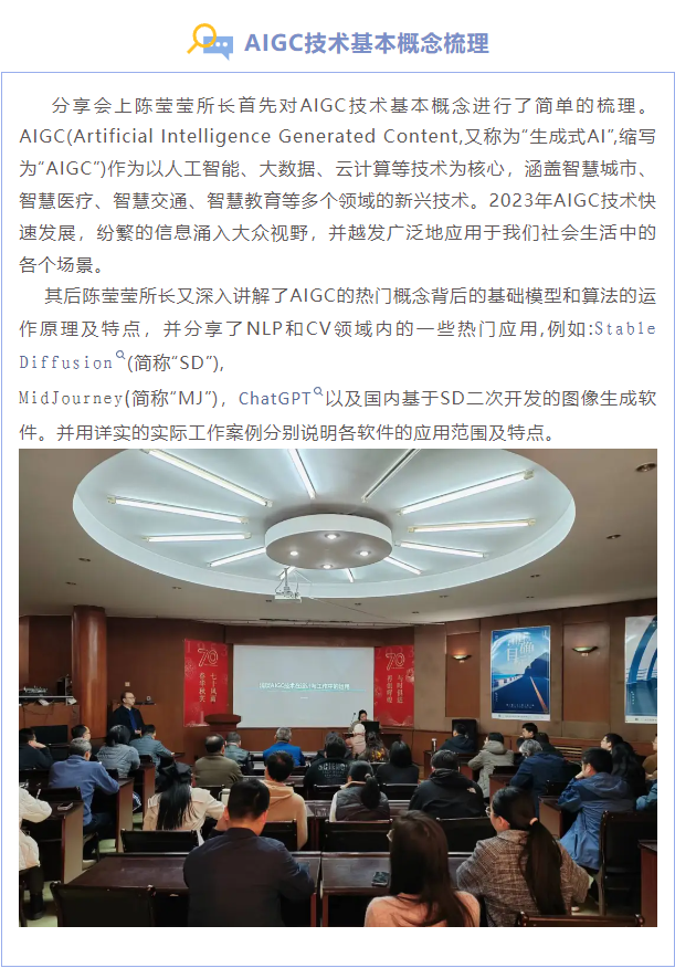 近日,由第一設(shè)計分院設(shè)計三所所長陳瑩瑩、景觀規(guī)劃所所長張璇、第九設(shè)計所建筑設(shè)計師曾添琳主講的“AIGC技術(shù)在建筑設(shè)計的應(yīng)用”主題分享會在公司二樓報告廳成功舉辦。