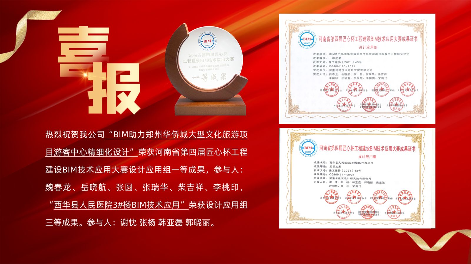 喜報!公司榮獲河南省第四屆匠心杯工程建設BIM應用大賽設計應用組多項成果