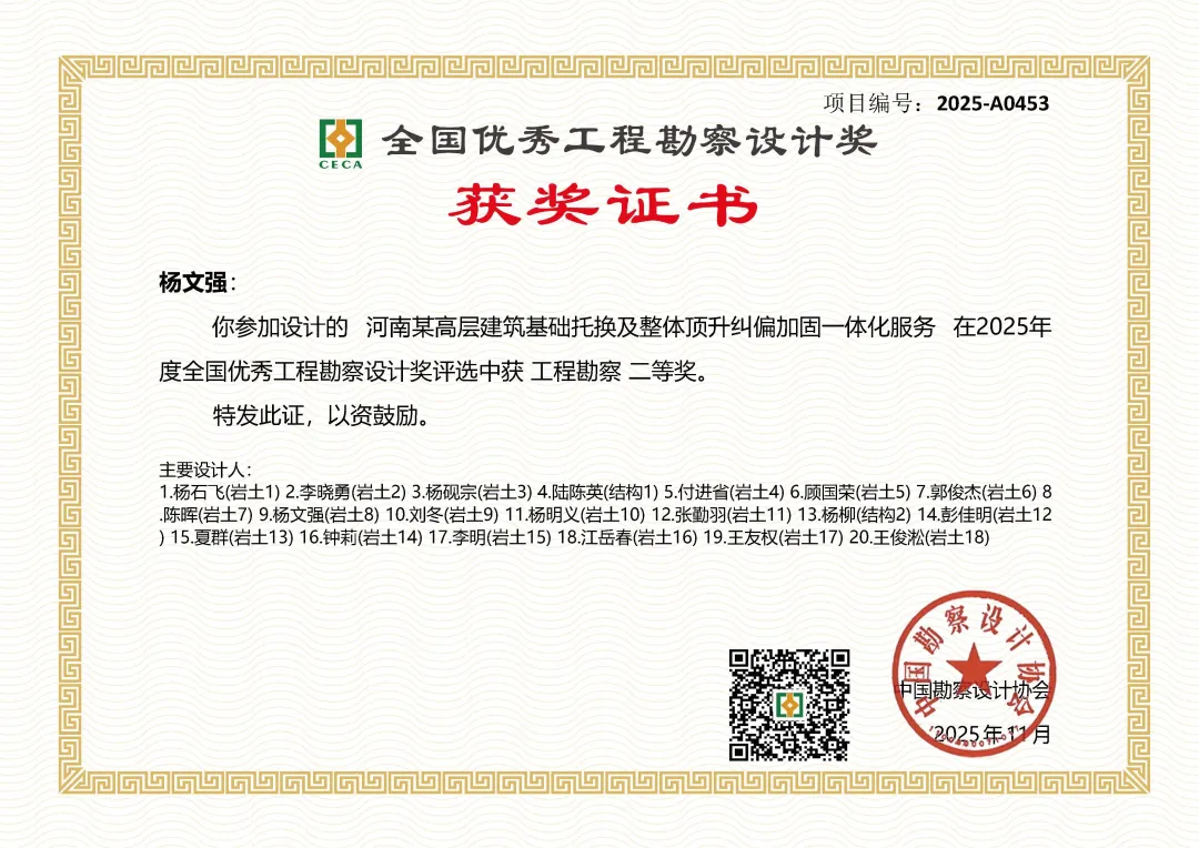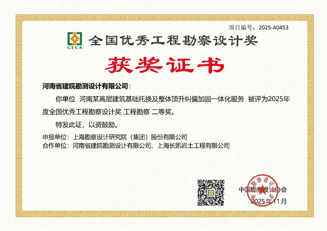 歲聿云暮,華章日新。值此新元肇啟之際,河南省院再傳捷報—由子公司河南省建院勘測設(shè)計有限公司作為主要參與方完成的河南某高層建筑基礎(chǔ)托換及整體頂升糾偏加固項目,榮獲2025年度全國優(yōu)秀工程勘察設(shè)計獎二等獎。