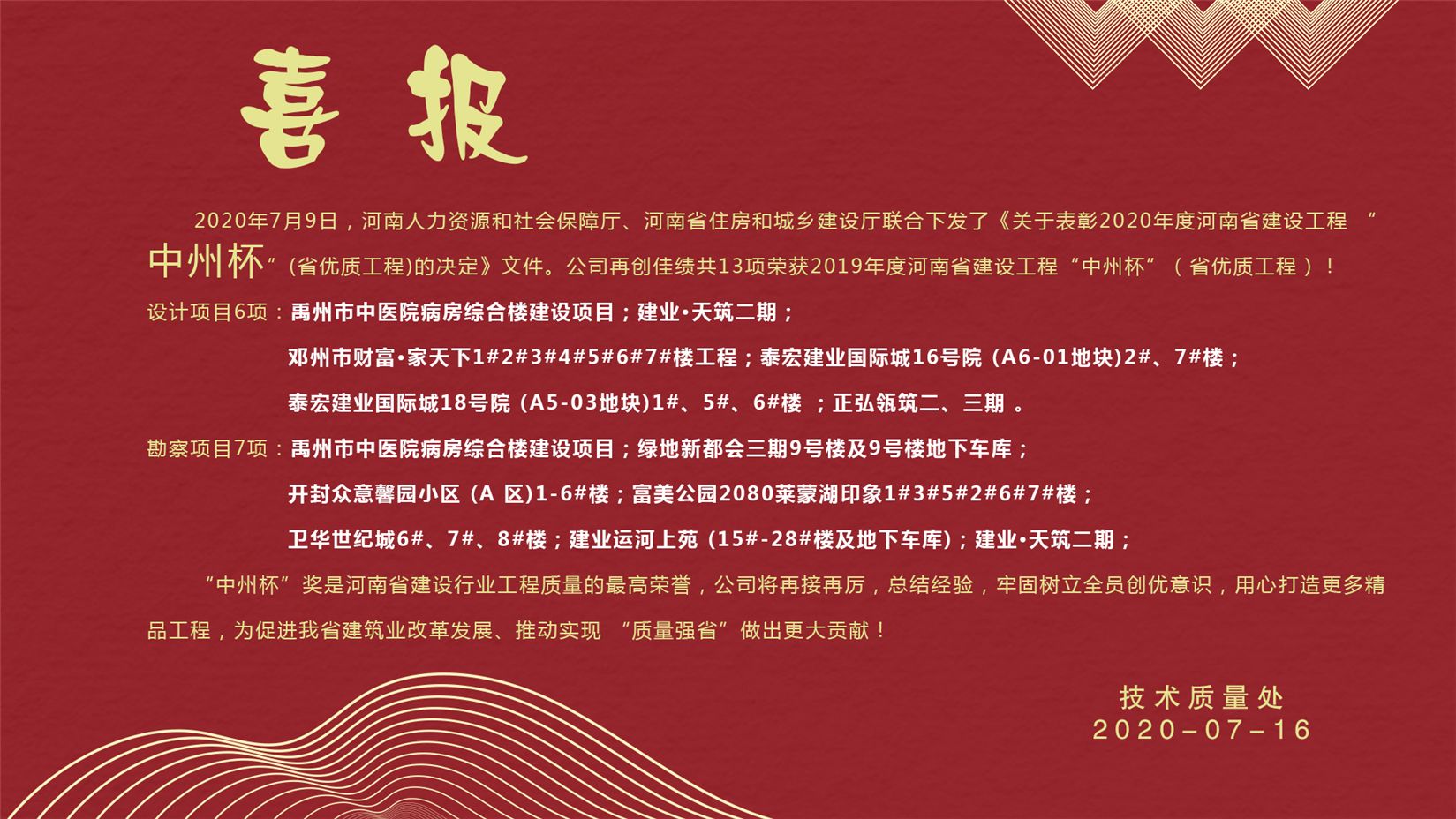 2020年7月9日,河南人力資源和社會(huì)保障廳、河南省住房和城鄉(xiāng)建設(shè)廳聯(lián)合下發(fā)了《關(guān)于表彰2020年度河南省建設(shè)工程 “中州杯”(省優(yōu)質(zhì)工程)的決定》文件。公司再創(chuàng)佳績(jī)共13項(xiàng)榮獲2019年度河南省建設(shè)工程“中州杯”(省優(yōu)質(zhì)工程)!