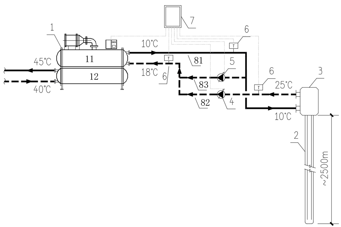 本課題示范工程研究了新型調(diào)溫技術(shù),提供一種新型中深層地?zé)岬芈窆芟到y(tǒng)的調(diào)溫系統(tǒng)。新型調(diào)溫技術(shù)將調(diào)溫結(jié)構(gòu)由電動旁通閥,通過一個循環(huán)水泵將所有循環(huán)水整體回泵,改進為額外設(shè)置一條獨立運行的回水管路,并為該管路配備獨立的第二循環(huán)水泵,在開始循環(huán)時,可以先由該獨立回水管路單獨運行,保證整機可以正常運行,之后再讓從地埋管中換得的熱水逐漸加入循環(huán),以防止因高溫保護導(dǎo)致的整機無法啟動。見下圖: