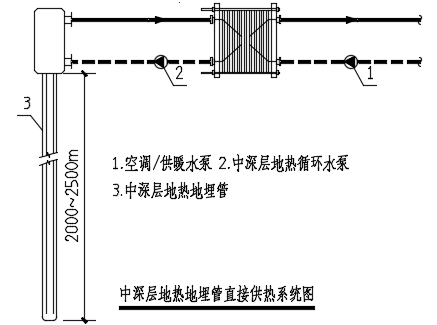 在過渡季節(jié)和供暖初期,中深層地?zé)嶙罡叱鏊疁囟饶苓_到50℃,熱泵機組不運行,換熱機組與中深層地埋管換熱后直接供暖或提供生活熱水。如圖: