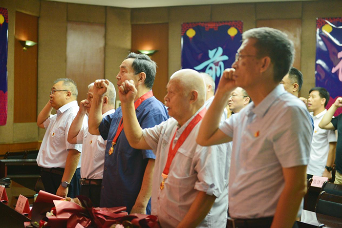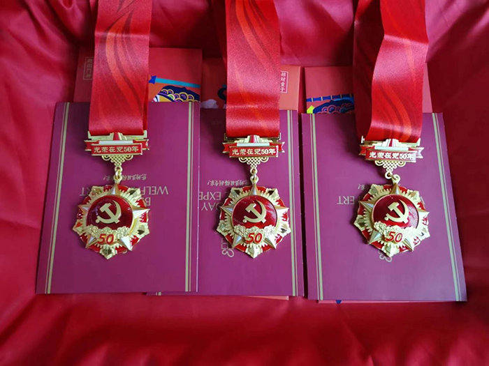在莊嚴(yán)雄壯的《紅旗頌》樂曲中,黨委成員為老黨員佩戴上“光榮在黨50年”紀(jì)念章,并一一獻(xiàn)上鮮花,全體與會(huì)人員熱烈鼓掌,和老黨員們共慶這意義非凡的時(shí)刻。