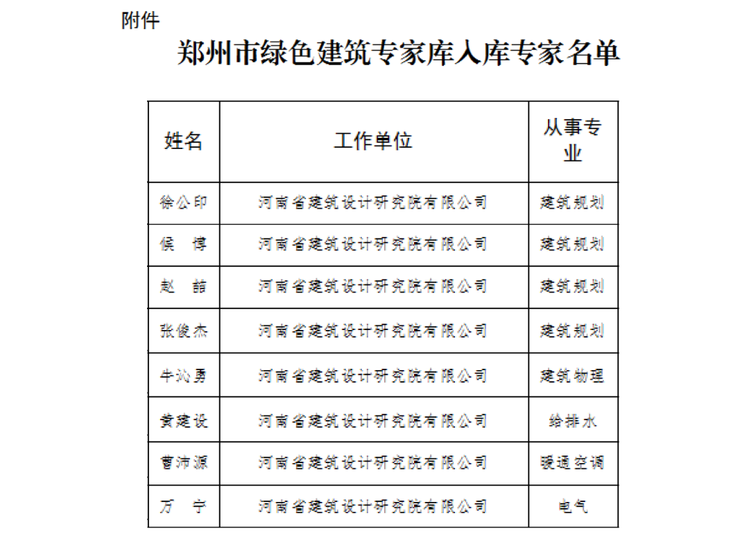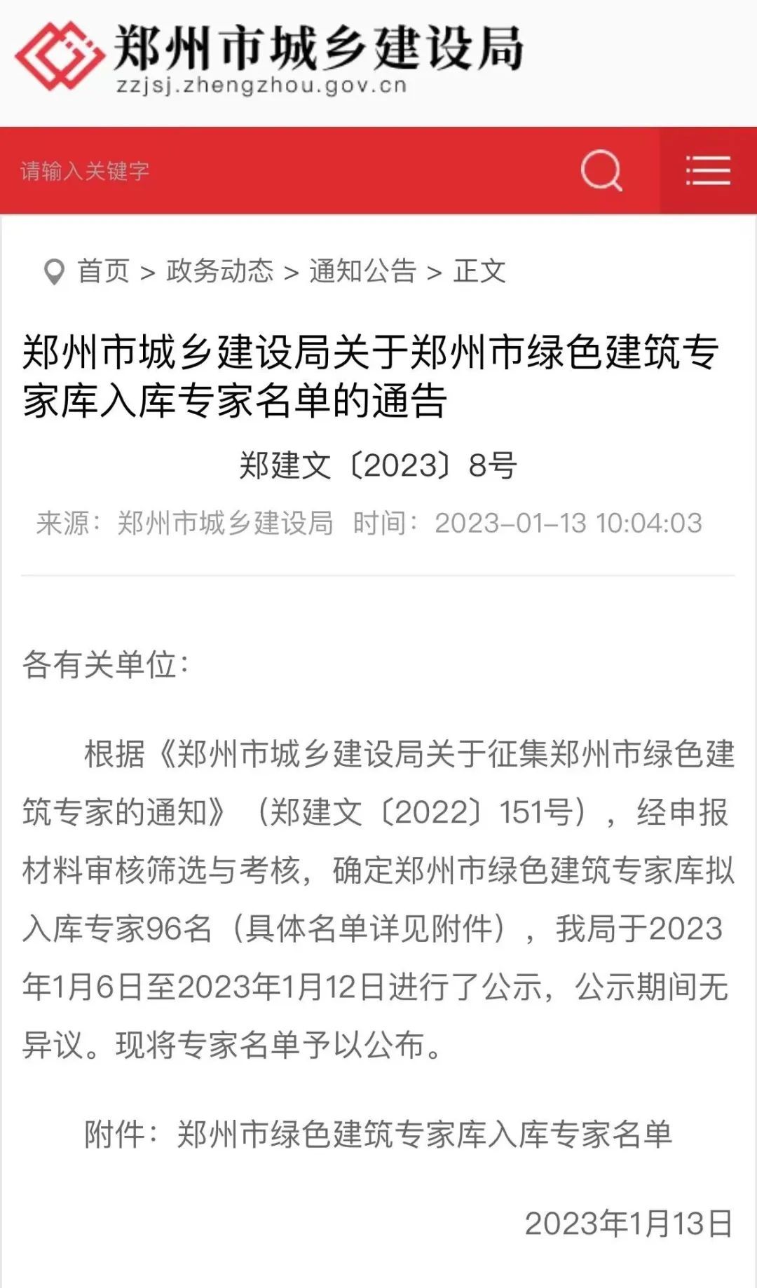 《鄭州市城鄉(xiāng)建設(shè)局關(guān)于鄭州市綠色建筑專家?guī)烊霂鞂<颐麊蔚耐ǜ妗罚ㄠ嵔ㄎ摹?023〕8號(hào))現(xiàn)已發(fā)布,河南省建筑設(shè)計(jì)研究院有限公司徐公印、侯博、趙喆、張俊杰、牛沁勇、黃建設(shè)、曹沛源、萬寧入選鄭州市綠色建筑專家。