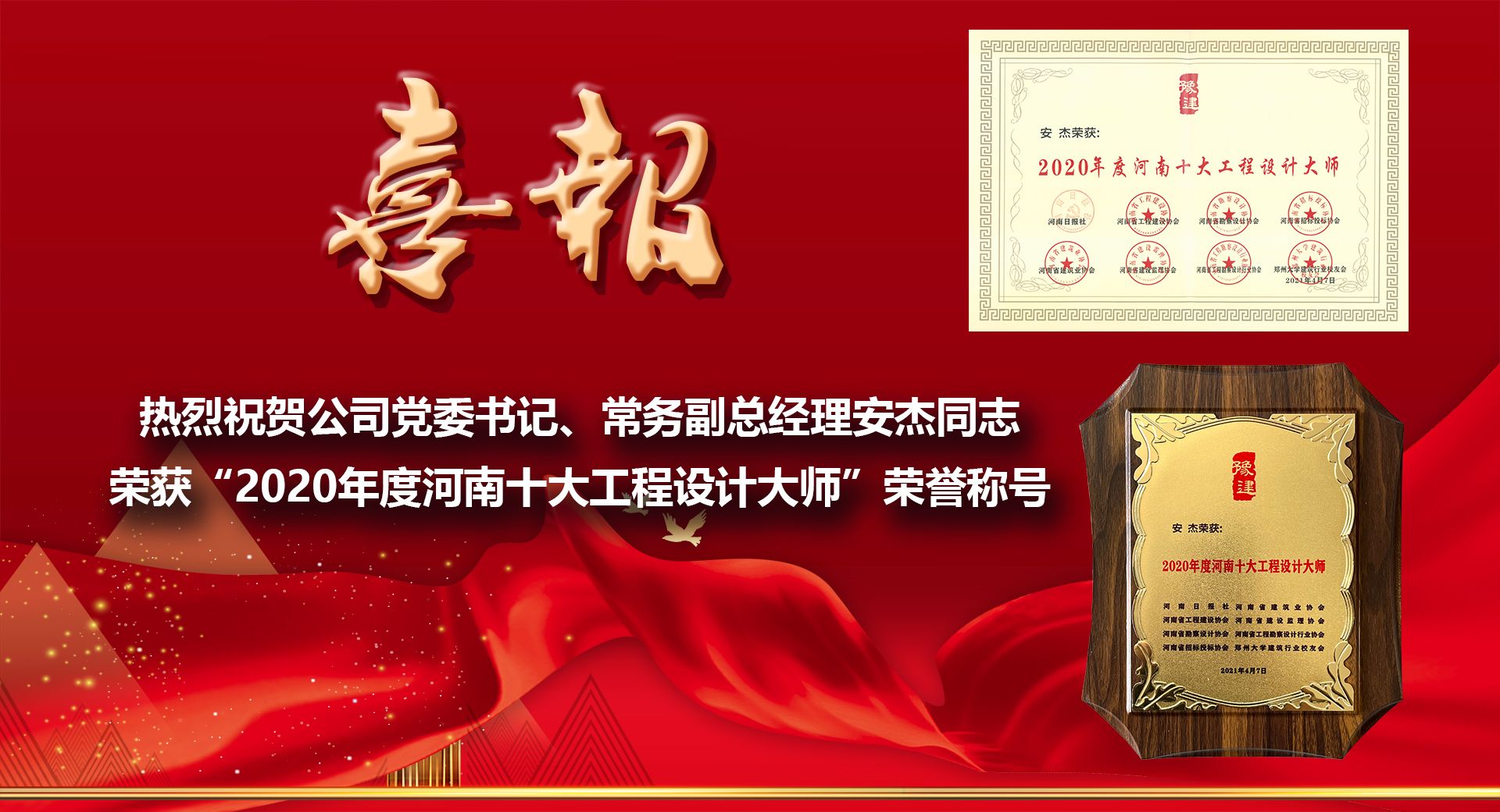 公司黨委書記、常務(wù)副總經(jīng)理安杰同志榮獲“2020年度河南十大工程設(shè)計大師”榮譽(yù)稱號