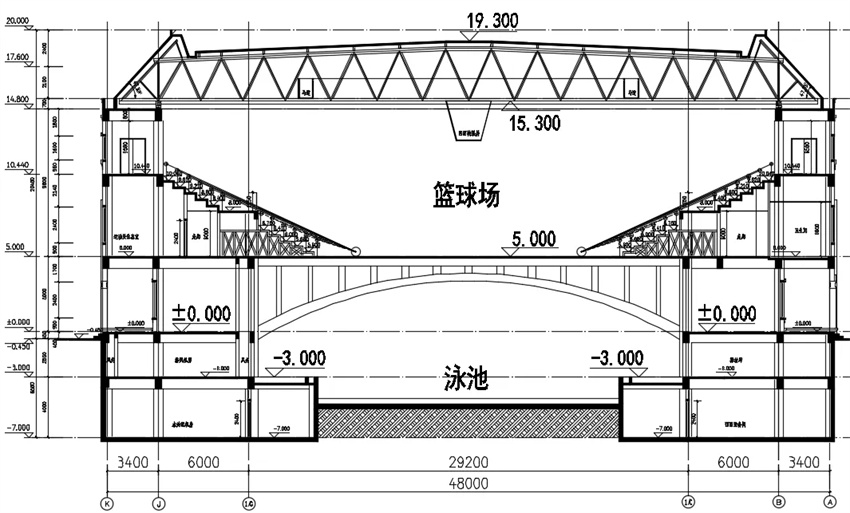 樓蓋體系:游泳池頂蓋采用現(xiàn)澆砼空腹拱架梁;籃球場(chǎng)屋蓋采用倒三角形立體管桁架。