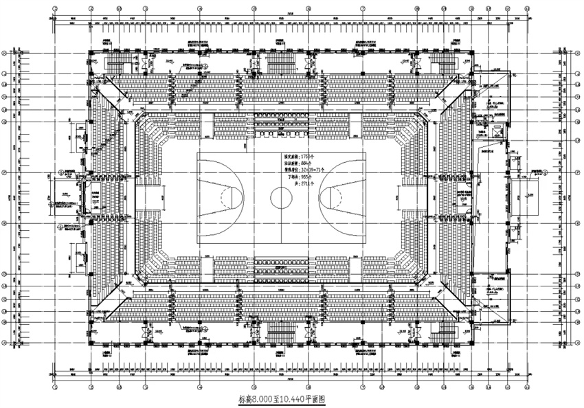 籃球館共有席位2711個(gè),其中活動(dòng)座椅884個(gè);籃球館屋蓋長(zhǎng)69m,寬41.2m;兩側(cè)有夾層,層高分別為5.44m和4.36m。