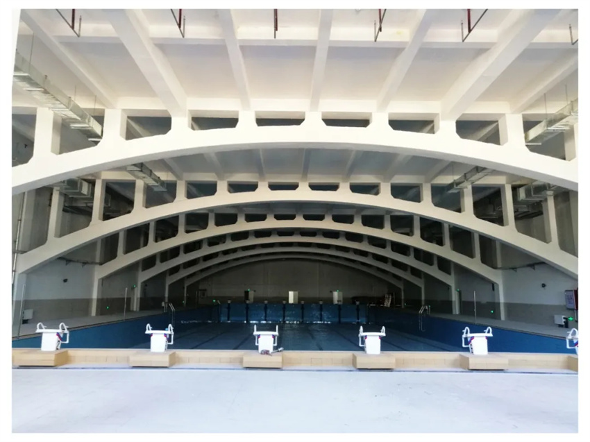 游泳館樓蓋采用現(xiàn)澆砼空腹拱架梁體系,規(guī)避了普通鋼結(jié)構(gòu)樓蓋在潮濕環(huán)境中防腐處理的難題,較好地平衡了結(jié)構(gòu)效率和建筑觀感,雖然跨度接近30米,結(jié)構(gòu)看起來依然輕巧通透。樓蓋次梁與豎向腹桿一一對(duì)應(yīng),更加強(qiáng)化了結(jié)構(gòu)自身的韻律感。