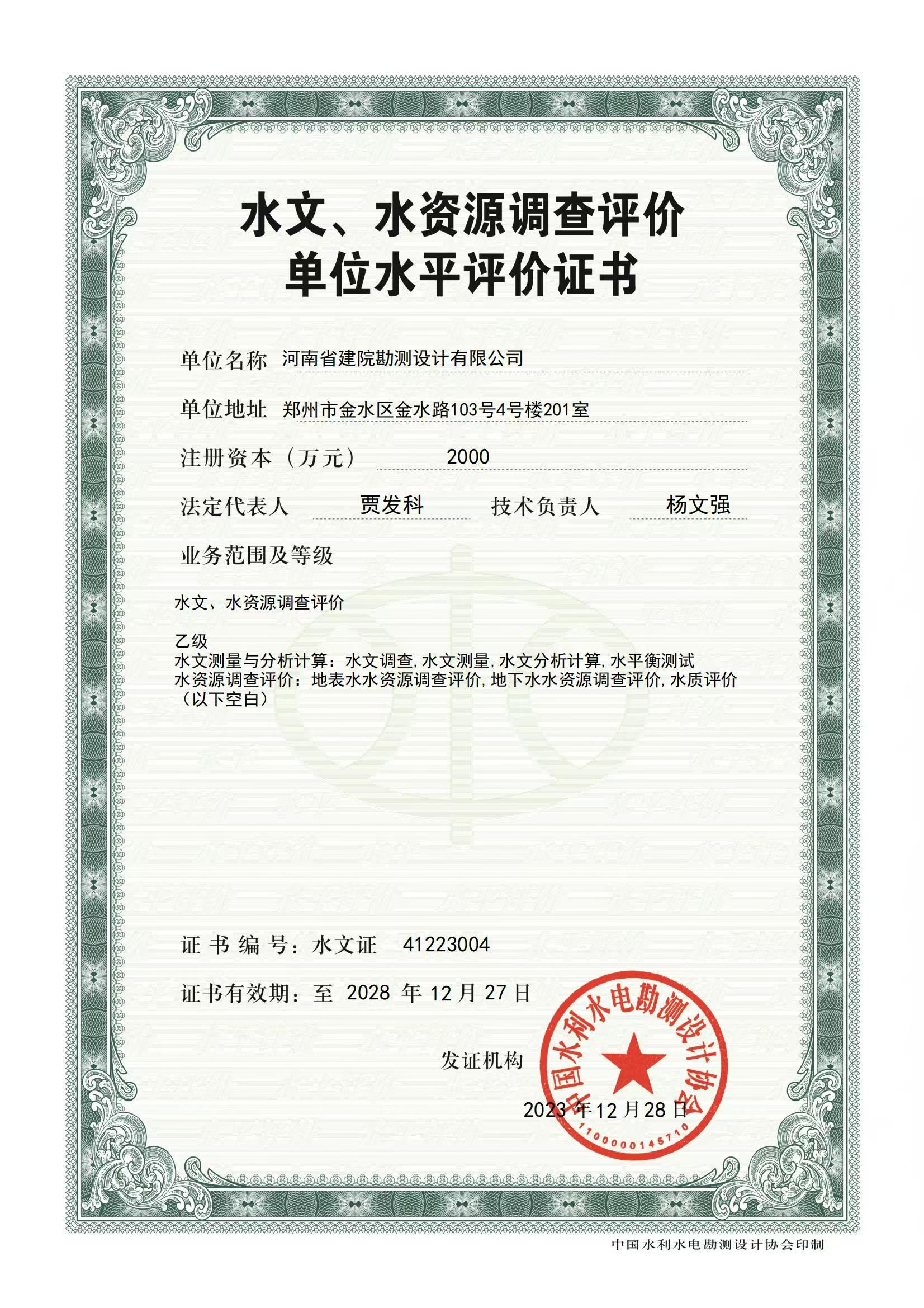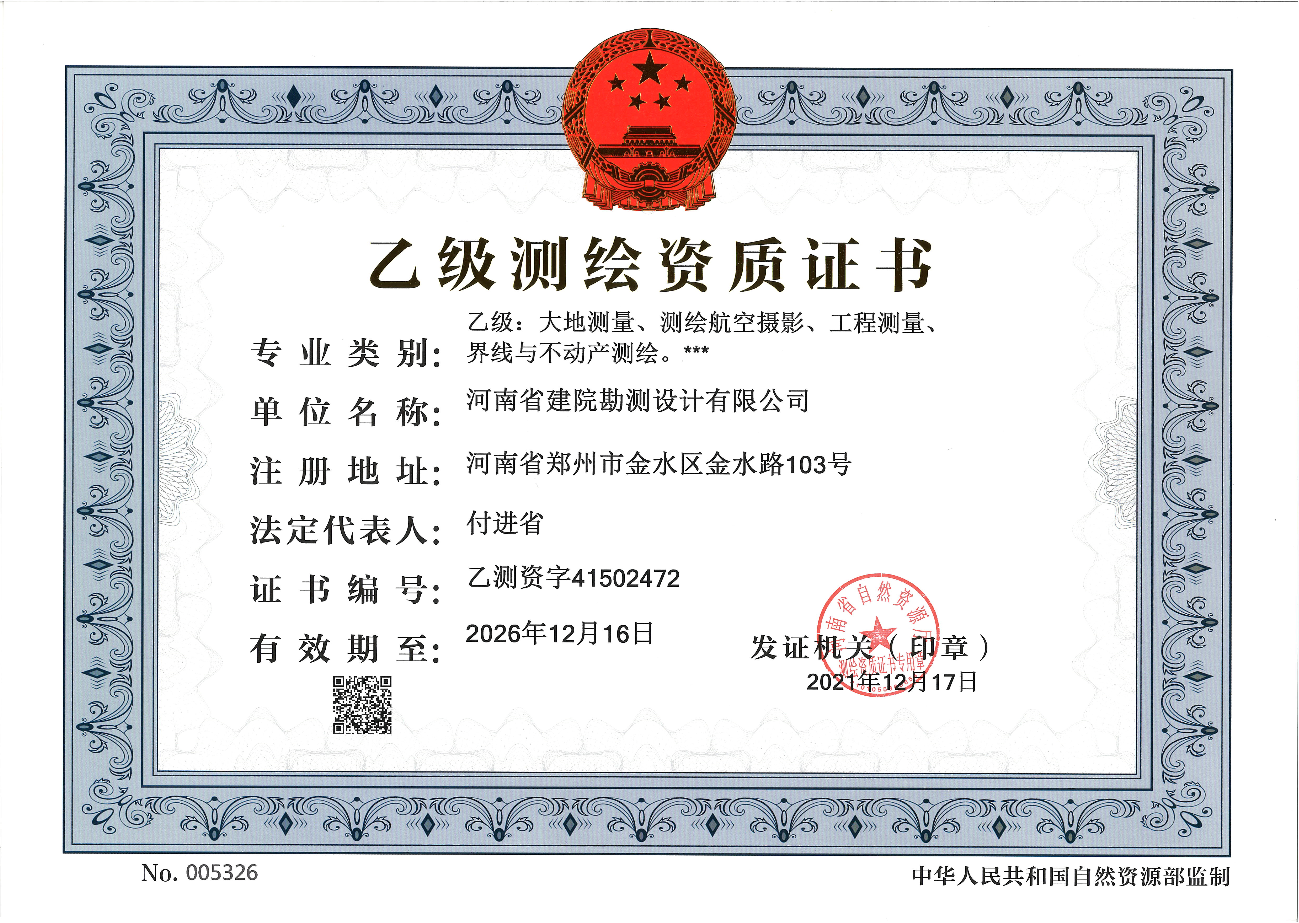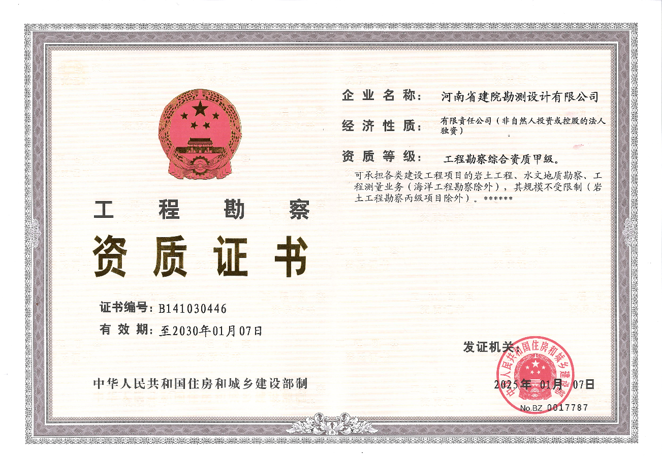 河南省建筑設(shè)計研究院有限公司持有建筑行業(yè)(建筑工程)、市政行業(yè)(道路工程、給水工程)、風(fēng)景園林工程設(shè)計、工程咨詢、造價咨詢、房屋建筑工程監(jiān)理等甲級,市政公用工程監(jiān)理乙級、城鄉(xiāng)規(guī)劃編制甲級、建筑人防乙級、商務(wù)糧乙級,壓力管道設(shè)計等資質(zhì)證書。 河南省建院勘測設(shè)計有限公司持有工程勘察綜合甲級、地基基礎(chǔ)工程專業(yè)承包壹級、乙級測繪等資質(zhì)證書。 河南省建院工程檢測有限公司持有地基基礎(chǔ)工程檢測資質(zhì)證書。 河南省建筑工程施工圖設(shè)計文件審查所有限公司持有施工圖設(shè)計文件審查一類資質(zhì)證書。
